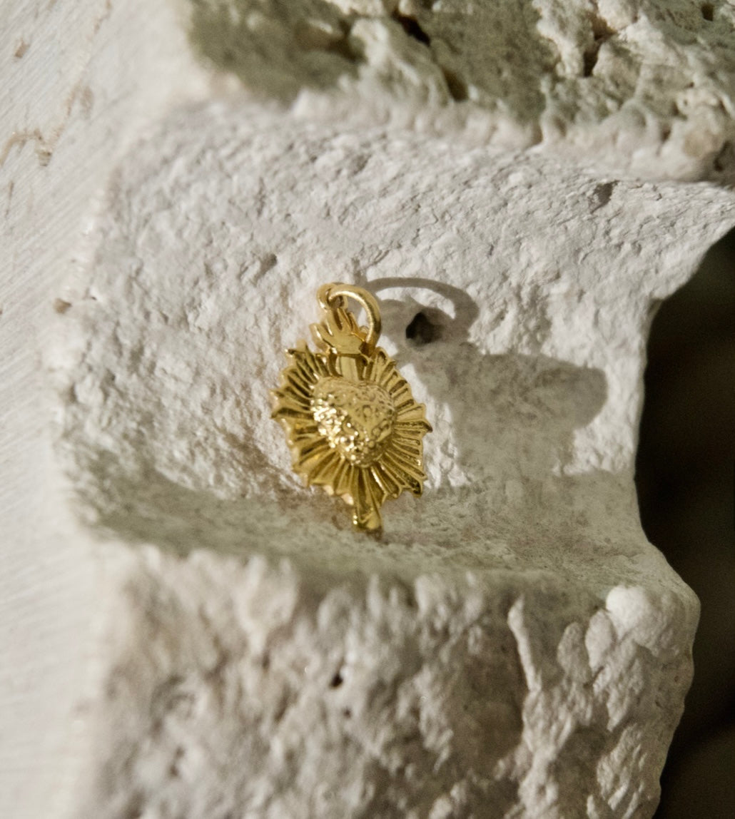 Dije de corazón inflamado. Plata bañada en oro 24k. Inspirado en la espiritualidad del Sagrado Corazón de Jesús.